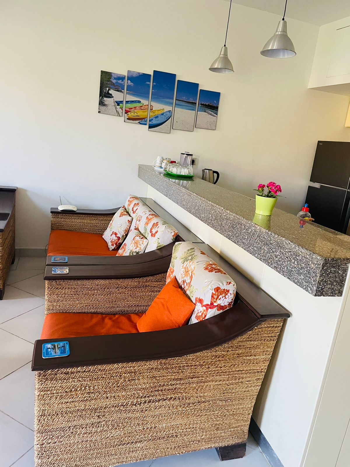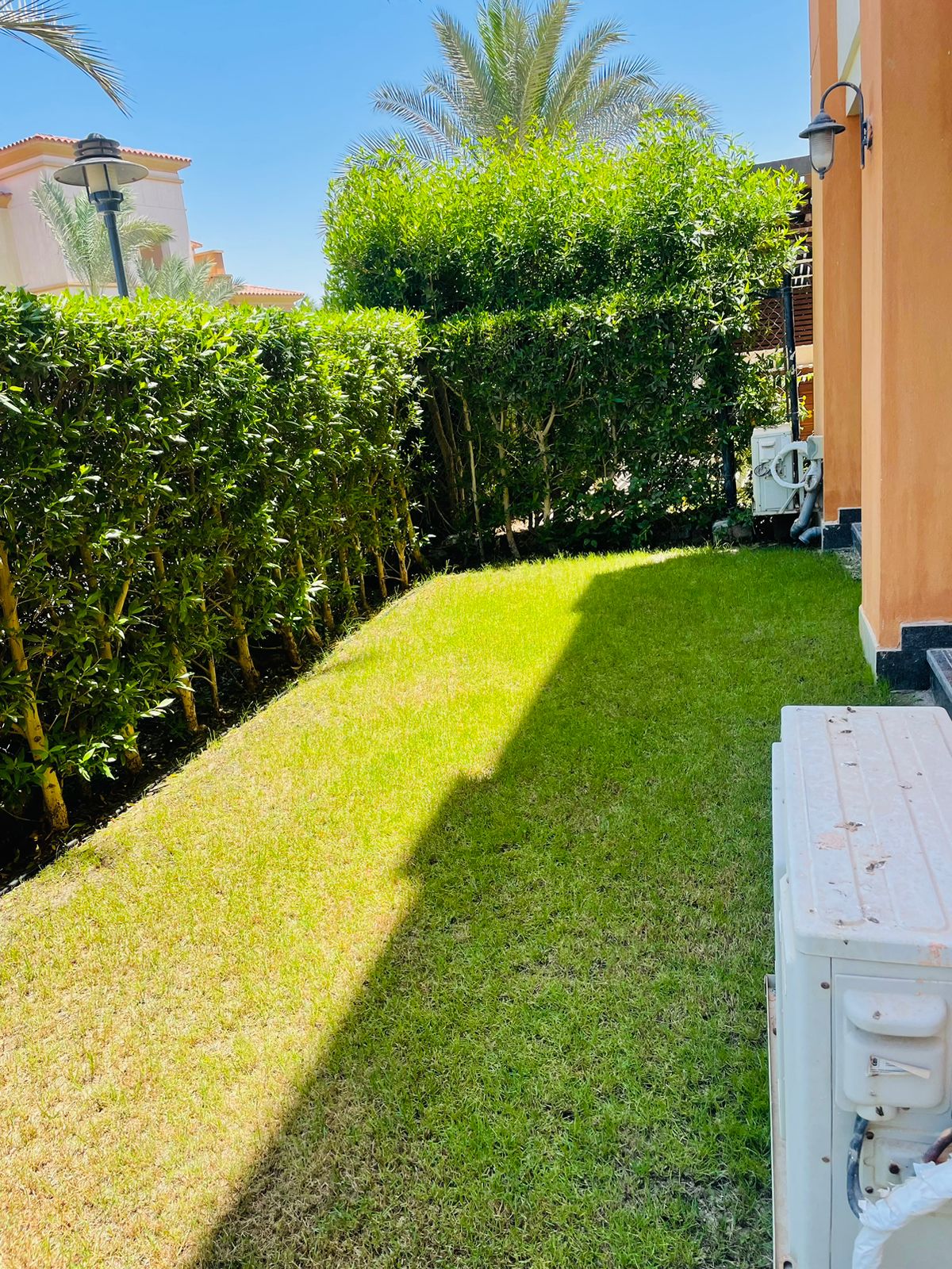 Ground floor chalet with 140 sqm and 70 sqm garden, 3 bedrooms, 2 bathrooms, fully furnished with appliances and AC. Rent 12,000 EGP per day.